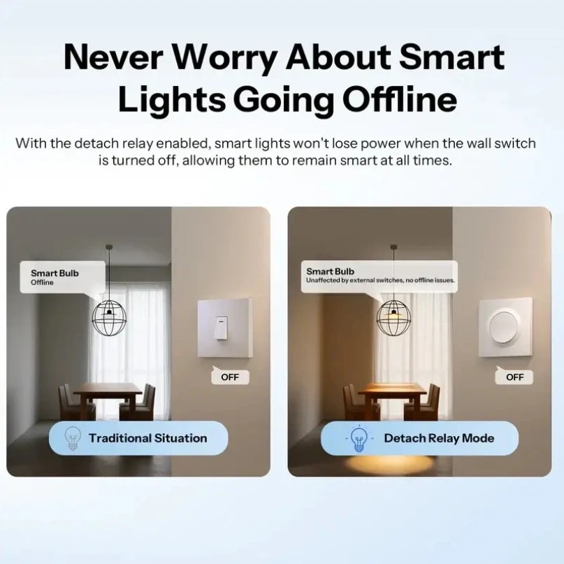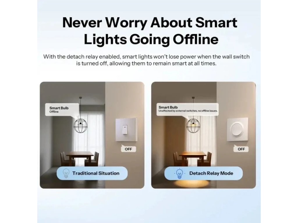 Speciální režim umožňuje oddělit fyzické stisknutí tlačítka od napájení relé. Chytré žárovky tak zůstávají stále online a připravené reagovat na automatizace nebo hlasové povely, i když světlo vypnete tlačítkem. To oceníte zejména při používání scén a pokročilých nastavení osvětlení.