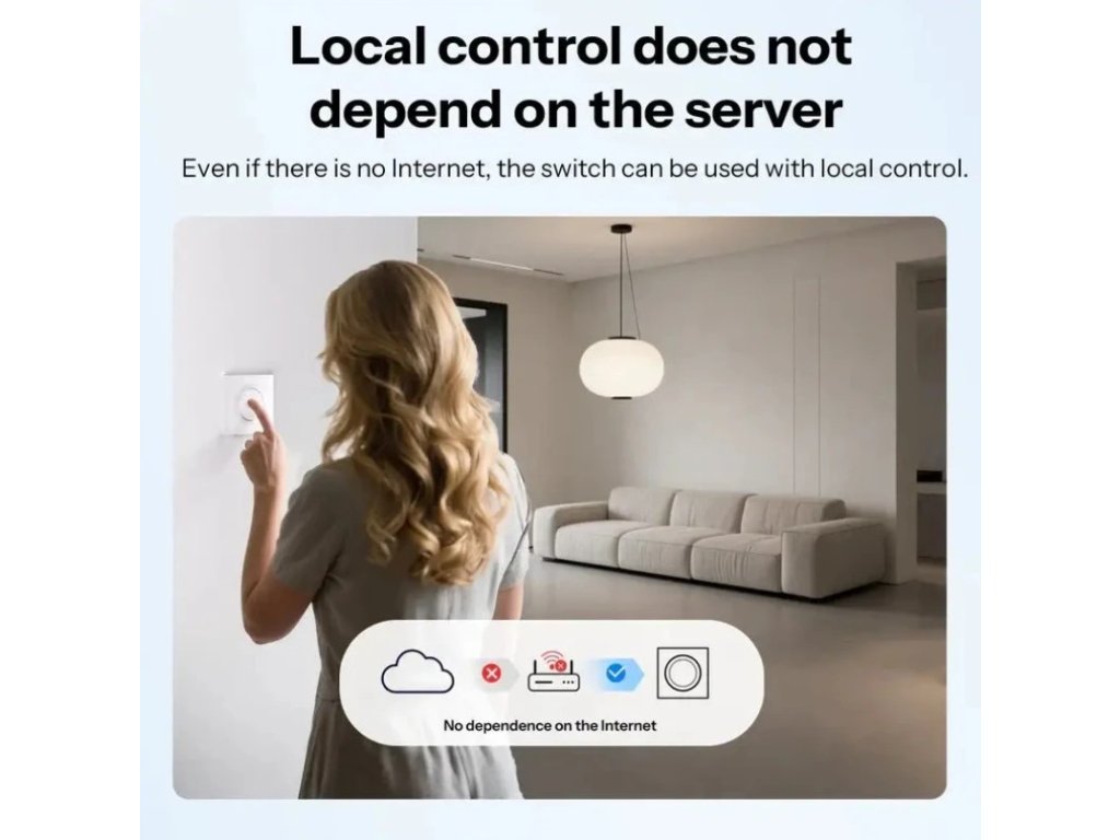 Zařízení funguje lokálně. Pokud dojde k výpadku routeru nebo internetu, vypínač stále pracuje jako běžný mechanický vypínač. Světlo tak můžete kdykoli ručně zapnout nebo vypnout bez závislosti na cloudových službách.