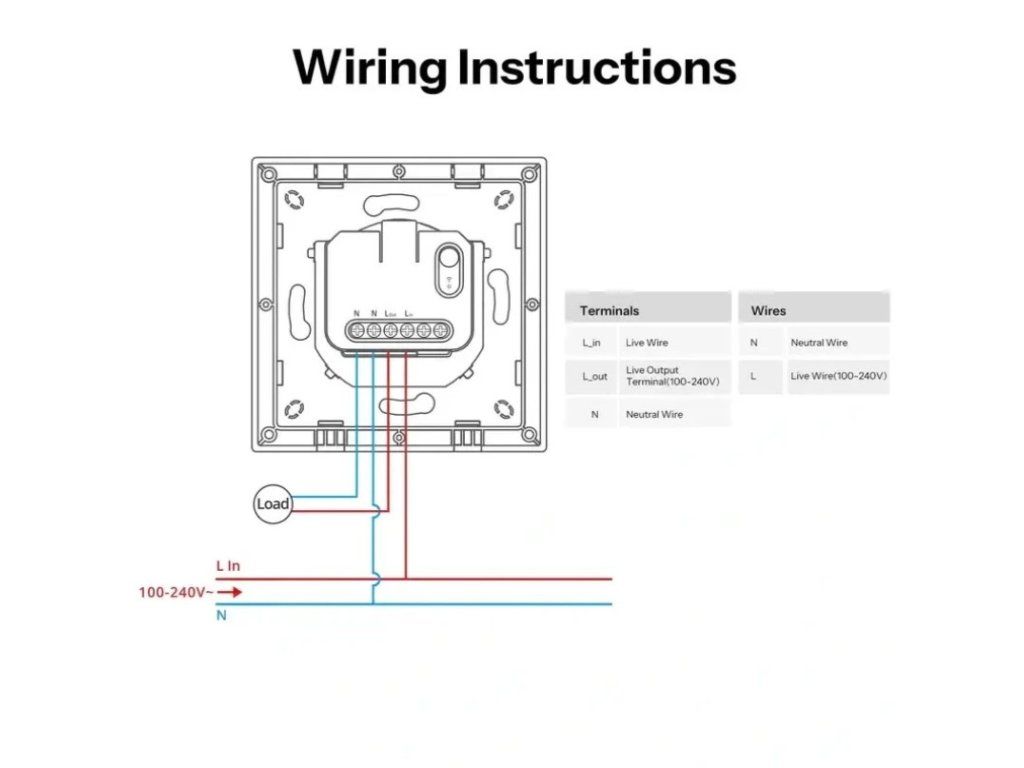 Napájení probíhá přímo ze sítě 100–240 V~, 50/60 Hz s maximální zátěží 10 A (odporová zátěž). Podporuje měděné vodiče 16AWG až 14AWG (plné i lankové).