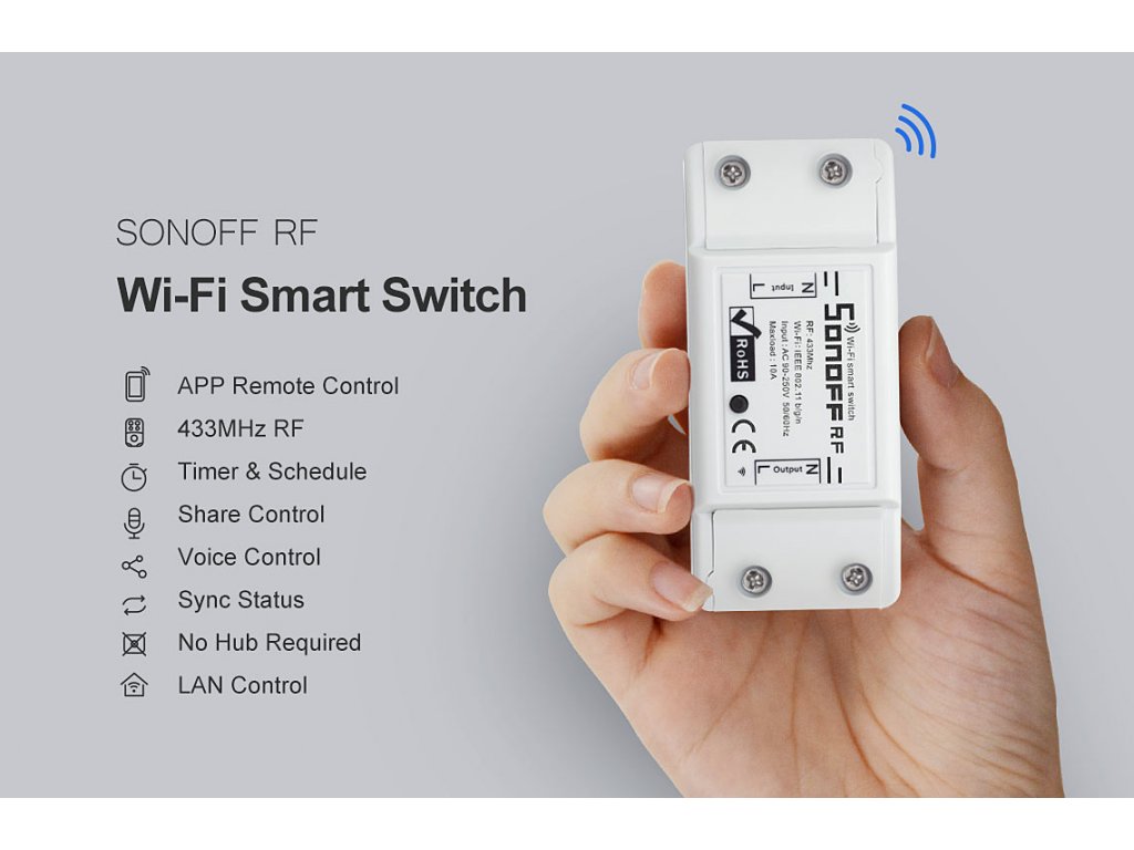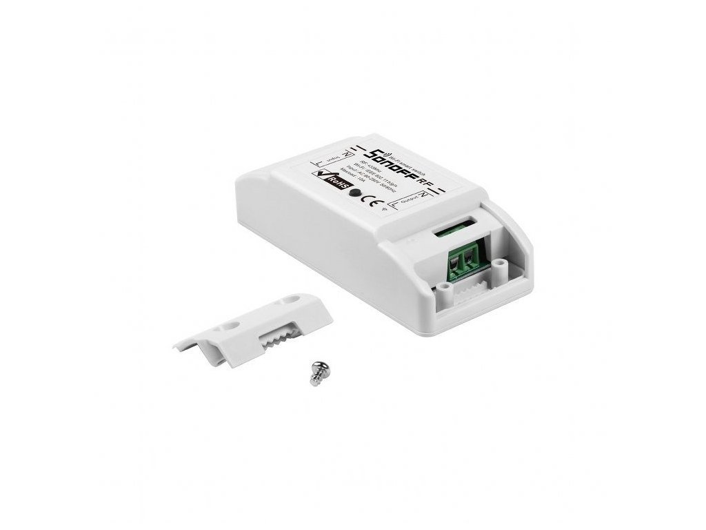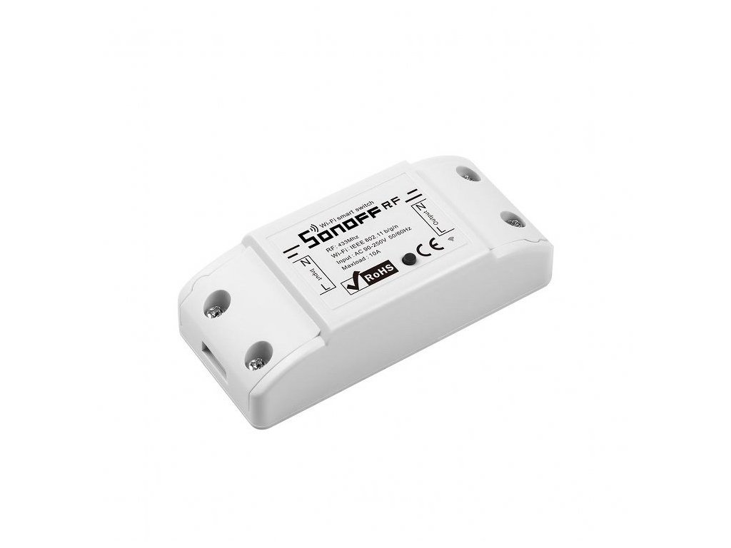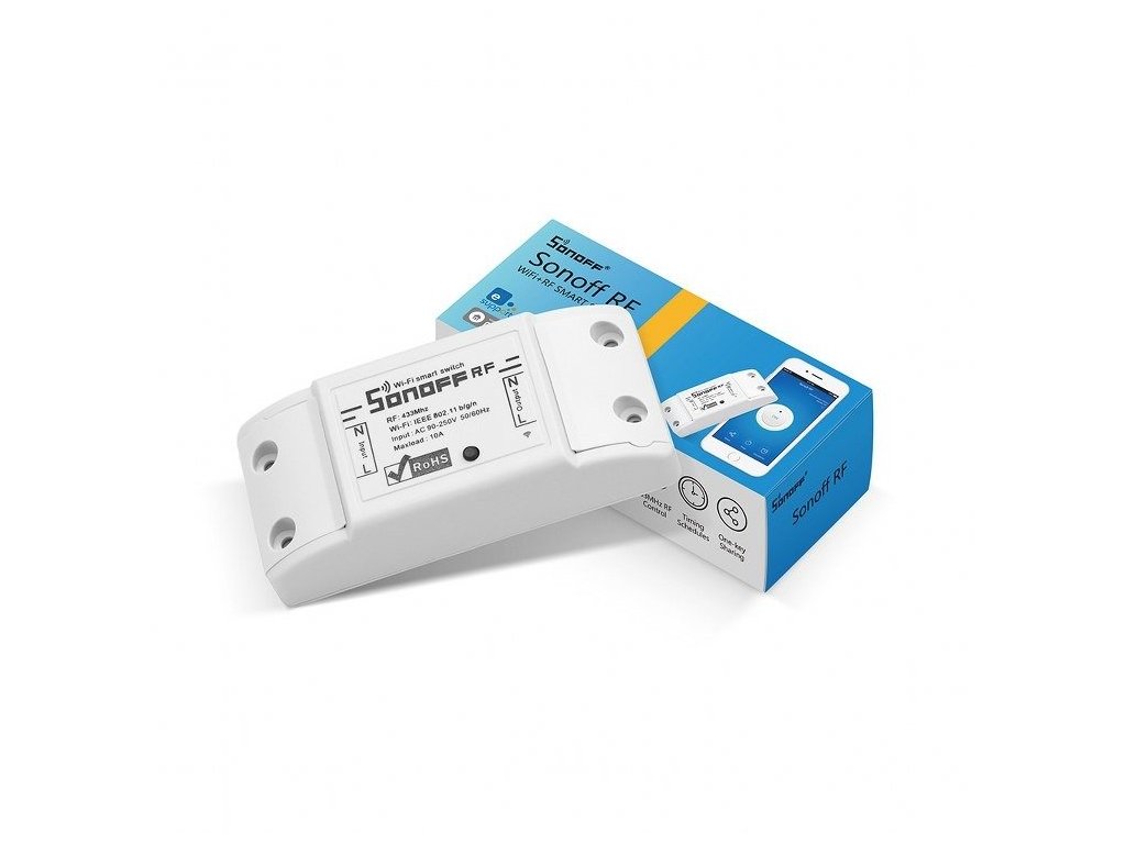 Opravená verze oblíbeného spínače Sonoff RF (IM151116003)Sonoff RF je levný chytrý WiFi spínač s modulem rádiového přijímače 433,92 MHz, který lze ovládat rádiovým dálkovým ovladačem. Jedná se o dálkově ovládaný vypínač, který lze připojit k široké škále zařízení. Elektrický spínač Sonoff RF přenáší data do cloudové platformy prostřednictvím připojení WiFi, které uživatelům umožňuje dálkově ovládat všechna připojená zařízení prostřednictvím mobilní aplikace eWeLink.