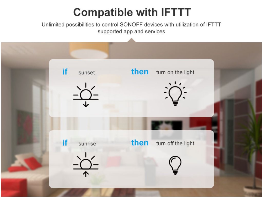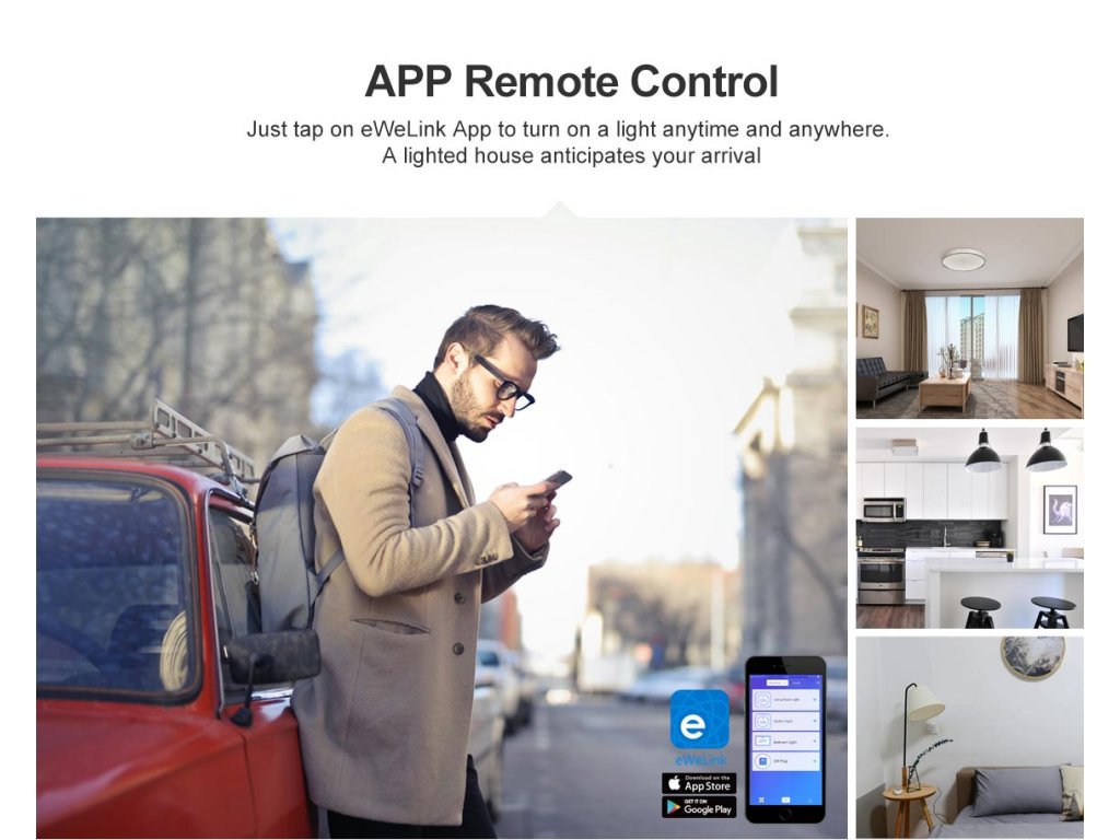 Uživatelé mohou připojené zařízení dálkově ovládat prostřednictvím bezplatné aplikace eWeLink dostupné na platformách iOS a Android a také pomocí rádiového dálkového ovládání. Podpora hlasu a spolupráce s chytrými asistenty je možná také díky kompatibilitě s Amazon Alexa, Amazon Echo, Echo Dot, Amazon Tap, Google Assistant, Google Home, Google Nest, IFTTT. Díky síťovému připojení je synchronizace stavu zařízení okamžitá, takže aplikace vždy zobrazuje aktuální údaje.