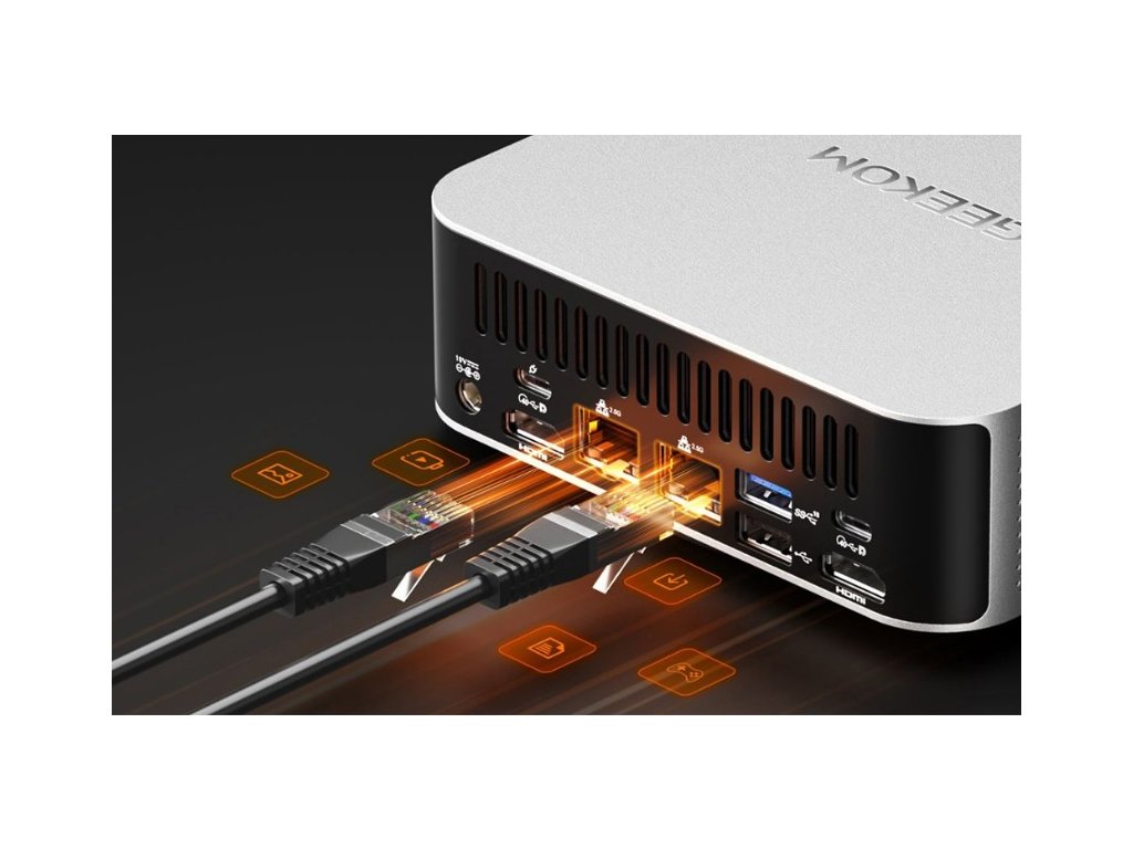 Navzdory kompaktním rozměrům nabízí GEEKOM A7 MAX konektivitu srovnatelnou s klasickým desktopem. K dispozici jsou dva porty USB4 s podporou DisplayPort Alt Mode a Power Delivery, doplněné o více portů USB 3.2 Gen 2 Type-A a jeden USB 2.0 port.