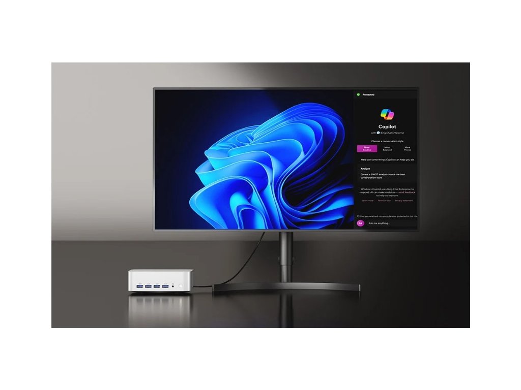Mini PC je dodáváno s předinstalovaným Windows 11 Pro, takže je připraveno k okamžitému použití bez nutnosti další konfigurace. Podpora VESA uchycení umožňuje elegantní montáž za monitor a úsporu místa na pracovním stole.