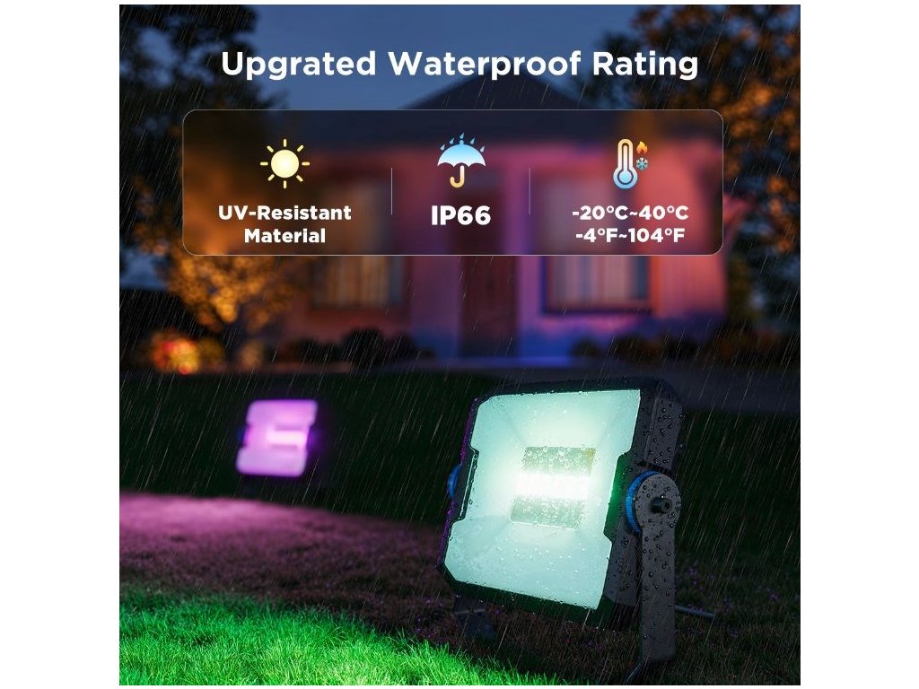 Díky stupni krytí IP66 jsou světla plně odolná vůči dešti, sněhu a prachu. Samotný napájecí adaptér voděodolný není, a proto musí být umístěn pod střechou nebo připojen profesionálně. Světla zvládnou provozní teploty od -20 °C do +50 °C, takže bez problémů fungují celý rok. Robustní provedení a možnost náklonu reflektoru v rozsahu až 270° zajišťují přesné směrování světla.