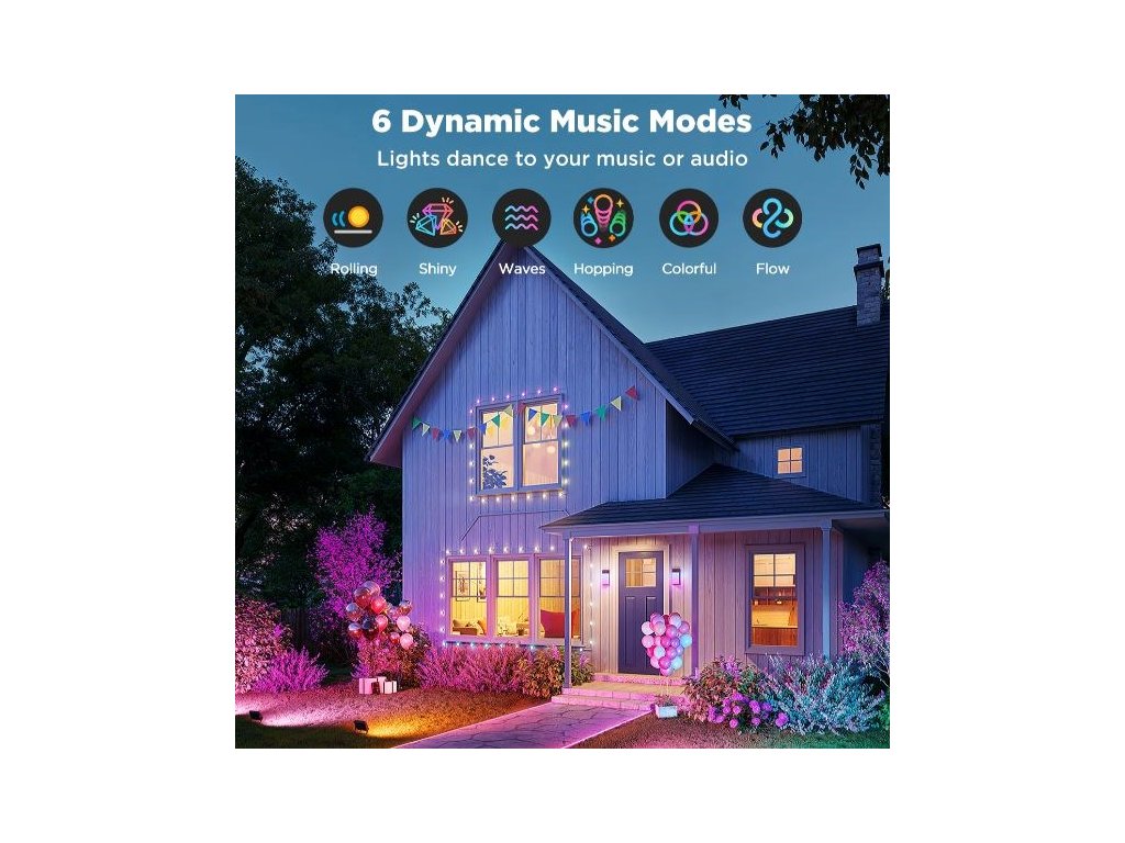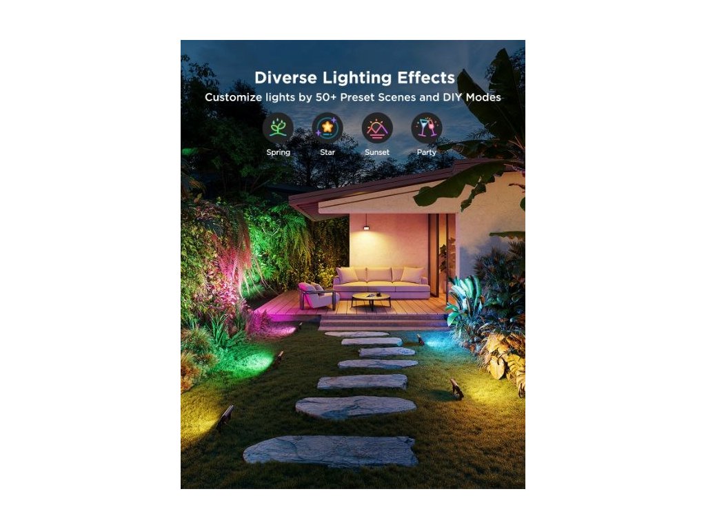 Každé ze čtyř světel může být nastaveno samostatně – jiná barva, jiný efekt. K dispozici je více než 50 světelných scén a také 6 hudebních režimů, které reagují na rytmus hudby díky vestavěnému mikrofonu. To z této sady dělá ideální volbu pro osvětlení zahradních party, svátečních výzdob nebo romantických večerů na terase.
