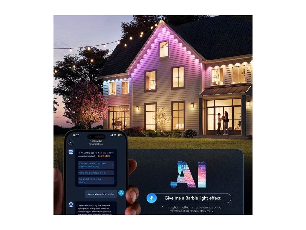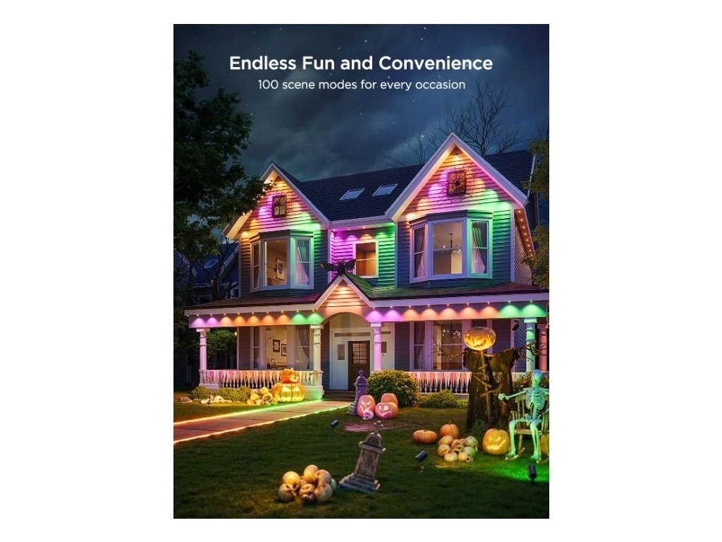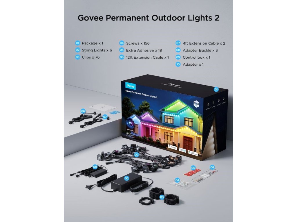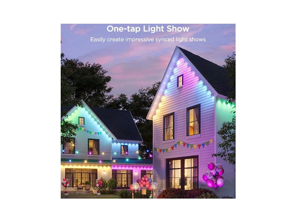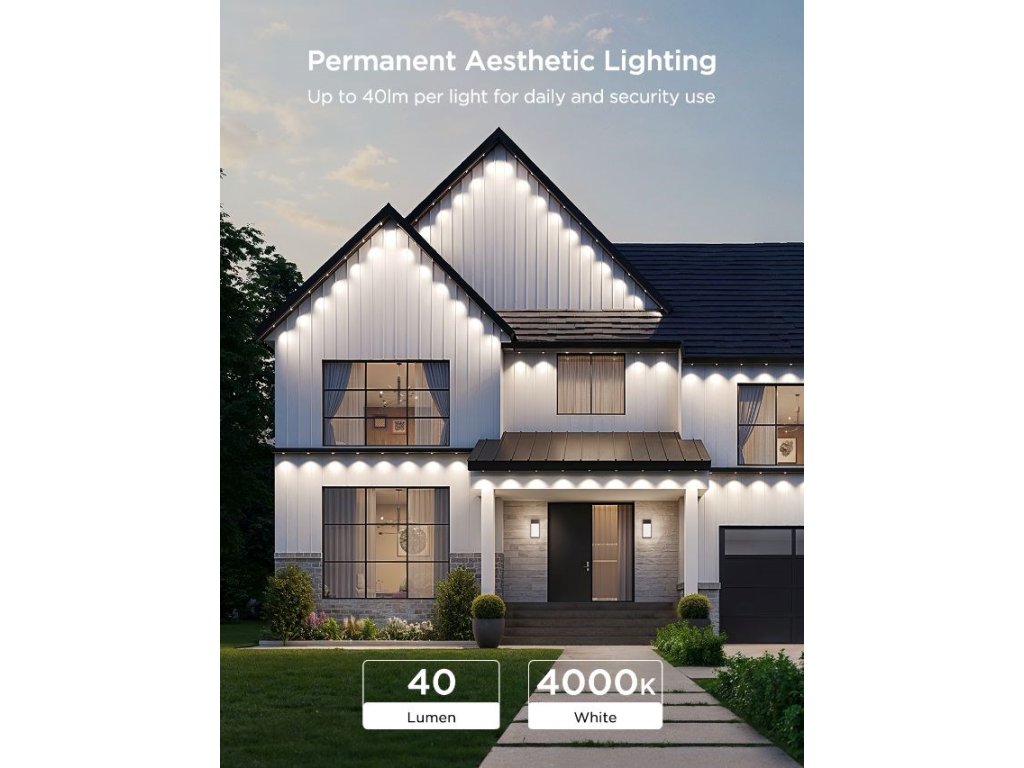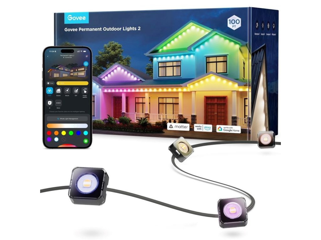 Permanentní venkovní světla Govee RGBICW o délce 30 metrů jsou ideální volbou pro trvalé venkovní osvětlení. Tento systém je navržen tak, aby bez problémů odolal rozmarům počasí a zároveň poskytoval elegantní a personalizovatelné světelné efekty. Vhodný je pro terasy, fasády domů, zahrady nebo příjezdové cesty. Technologie RGBICW umožňuje zobrazení až 16 milionů barev a až 57 odstínů současně, přičemž k tomu přidává dedikované bílé LED diody pro přirozené podání bílé.