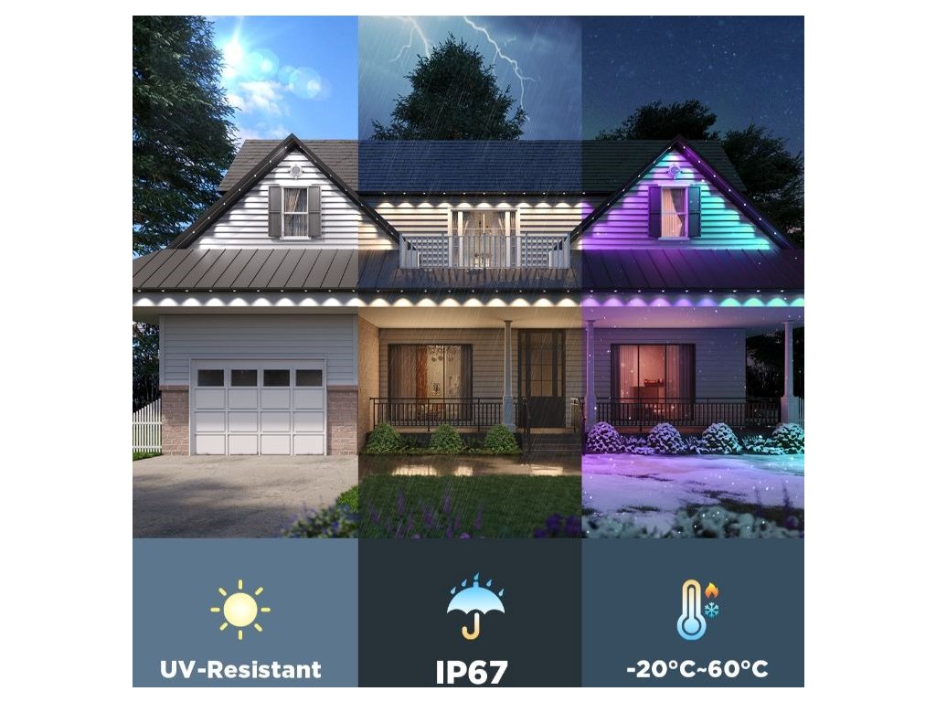Venkovní světla Govee jsou konstruována tak, aby bez problémů fungovala celý rok. Díky voděodolnosti IP67 (adaptér IP65) odolávají dešti, sněhu i prachu. Povrchová úprava navíc obsahuje UV ochranu, takže je můžeš bez obav instalovat i na místa s přímým slunečním zářením. Pracovní teplota je od -20 °C do +60 °C, což zaručuje funkčnost i v extrémních podmínkách.