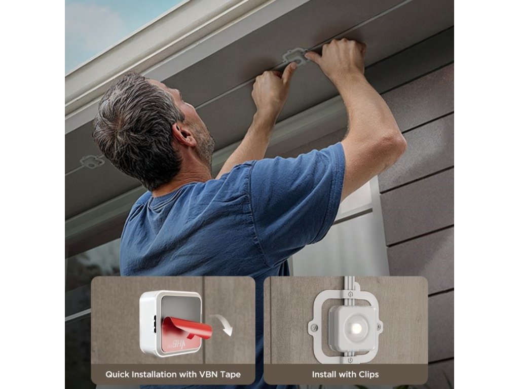 Montáž světel je snadná a rychlá. Součástí balení je montážní materiál, který kombinuje samolepicí 3M pásky a šroubovací rámečky, které zajišťují stabilitu i při dlouhodobém venkovním použití. Každý segment lze uchytit s přesností, takže pásky pevně drží na zdi nebo jiné ploše i bez nutnosti časté údržby.