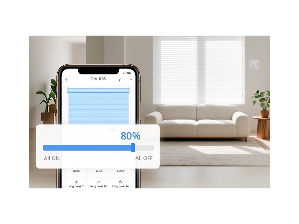 Spínač Orb-RBS neumožňuje pouze úplné otevření či zavření žaluzií, ale také přesné nastavení v požadovaném rozsahu. Můžete tak žaluzie plynule polohovat – například na 30 % pro jemné světlo ráno, nebo na 70 % pro snížení oslnění. Nastavení je dostupné přes mobilní aplikaci pomocí posuvníku.