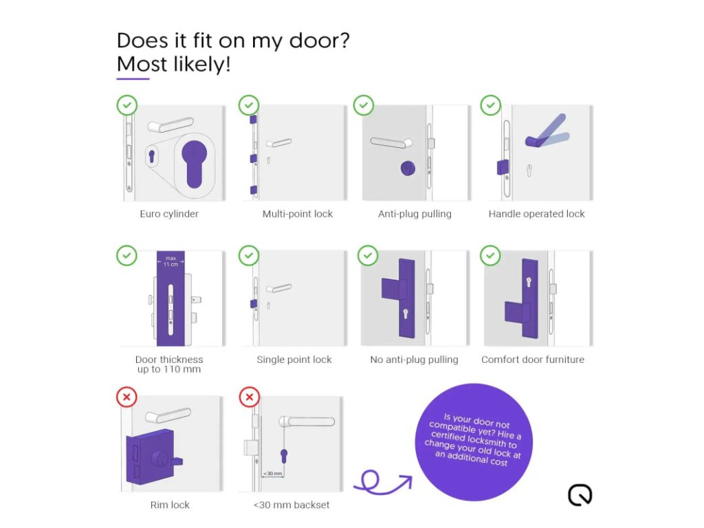 Zámek je vhodný pro dveře o tloušťce do 110 mm (symetrické dveře) nebo do 55 mm měřeno od šroubu válce. Podporuje běžné rozteče (PC) 55, 72, 92 a 110 mm. Nepodporuje posuvné dveře s dlouhou klikou nebo dveře vystavené extrémním povětrnostním vlivům.
