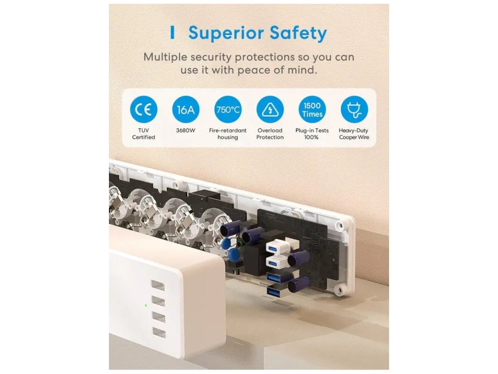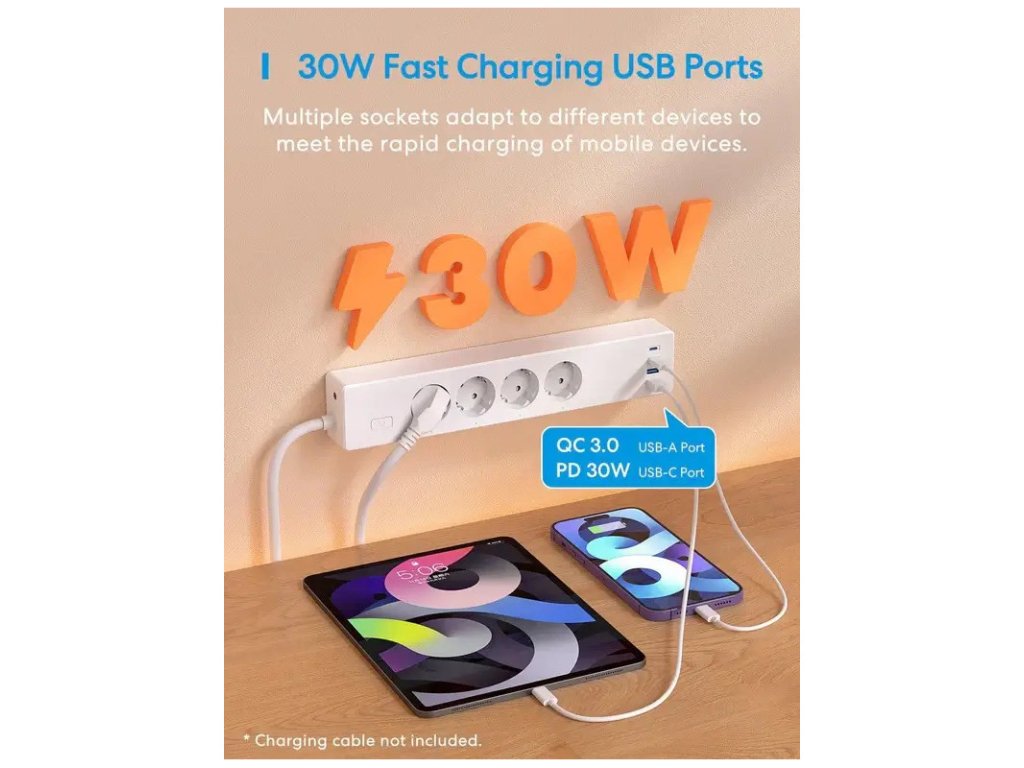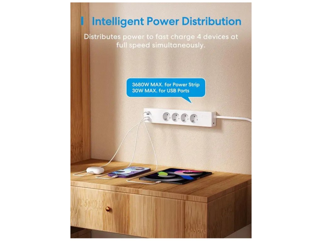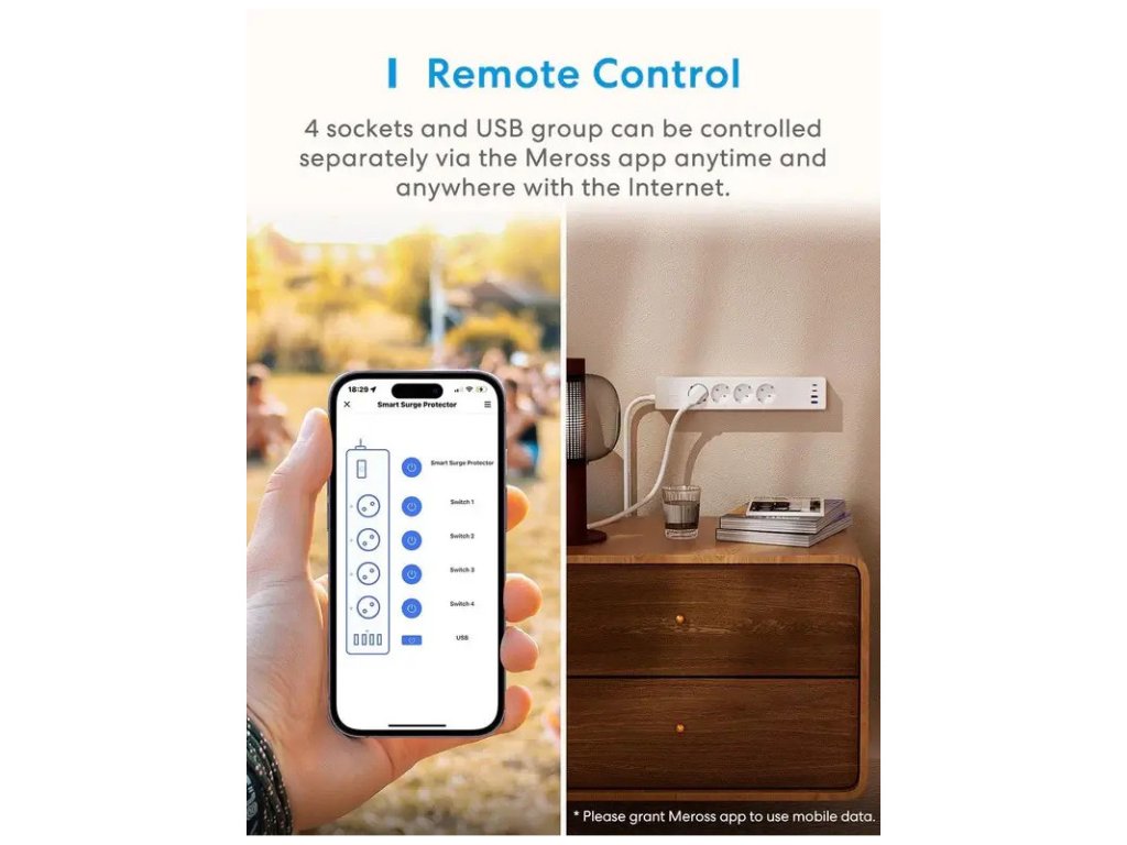 Meross Matter Smart Prodlužovačka s rychlým nabíjením, 4 AC + 2 USB-C + 2 USB-A, MSP844SMA (EU verze) je všestranný a inteligentní prodlužovací kabel navržen tak , aby poskytoval tradiční AC zásuvky i USB nabíjecí porty.