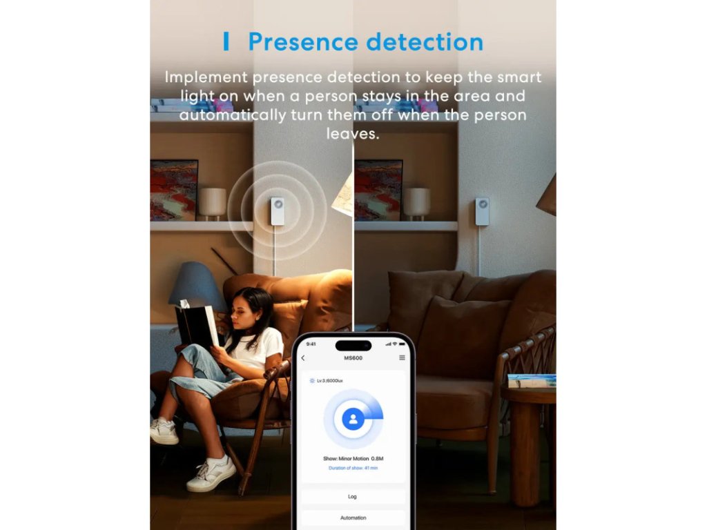 Meross MS600MA kombinuje milimetrový radar a PIR senzor, takže dokáže detekovat nejen pohyb, ale i přítomnost člověka bez pohybu – třeba při čtení nebo sledování televize. Navíc obsahuje světelný senzor pro chytré scény závislé na jasu.