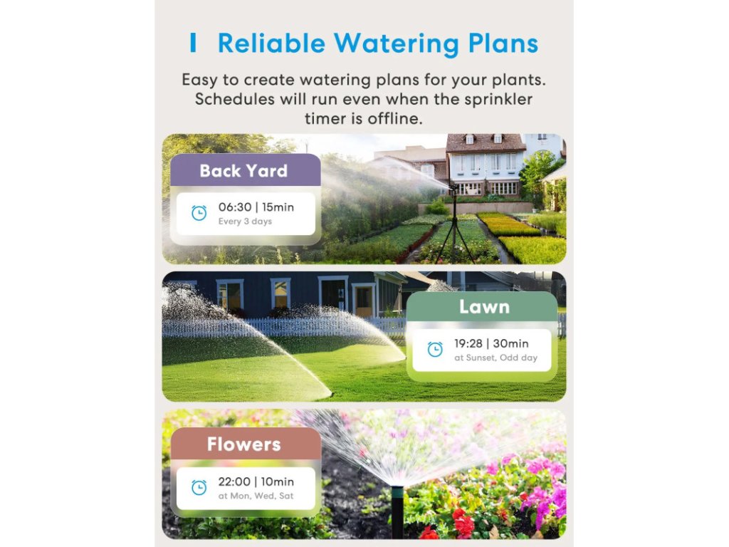 Naplánujte si rozvrhy zálivky podle dne, času či sezóny, které běží spolehlivě i při offline režimu. Funkce Smart Weather Skip automaticky vynechá zálivku před deštěm, při mrazu nebo silném větru.