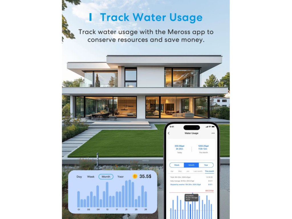Aplikace Meross umožňuje sledovat spotřebu vody a přijímat upozornění na neobvyklé chování nebo výpadky. Díky tomu snížíte ztráty a ušetříte vodu i náklady.