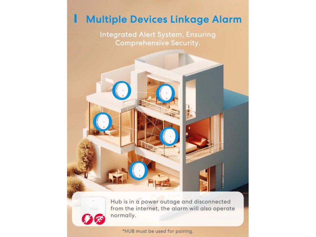 Zařízení využívá dvojité optické senzory, které výrazně snižují riziko falešných poplachů. Detekce kouře probíhá během pouhých 2 milisekund a funguje spolehlivě na různé druhy kouře i páry. Detektor vydává hlasitý alarm o síle 85 dB, který je možné zesílit sirénou centrálního hubu až na 110 dB.