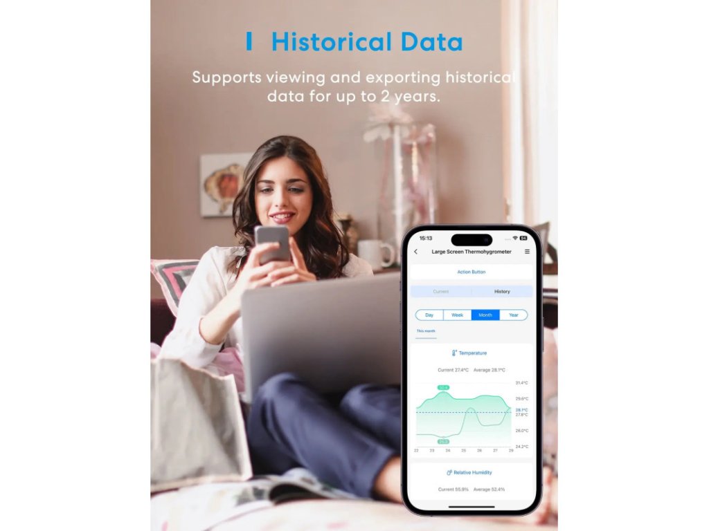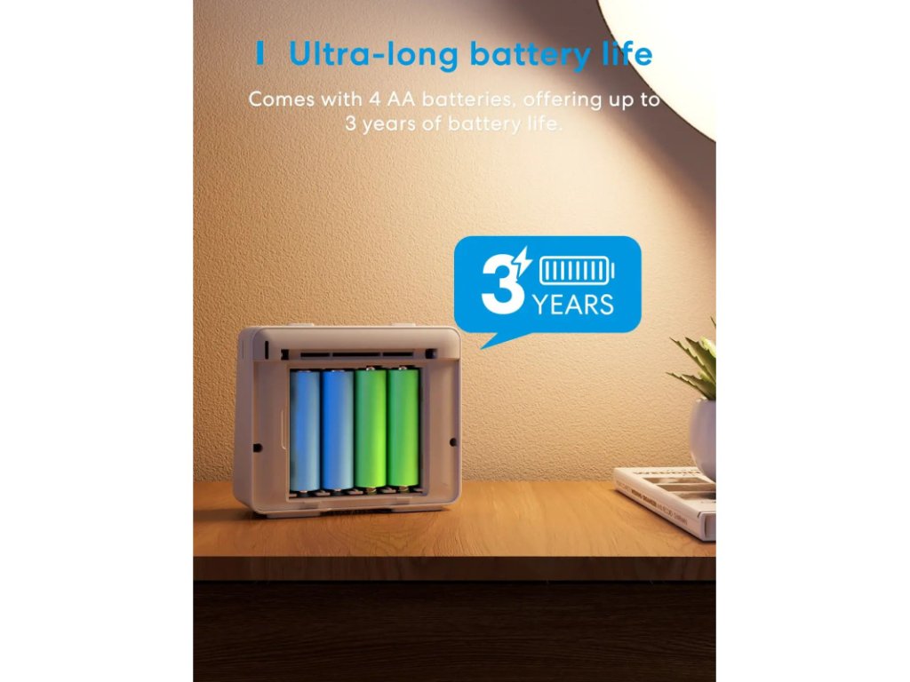 Napájený čtyřmi běžnými AA bateriemi, senzor vydrží až 3 roky provozu. Interní paměť zvládne uchovat až 2 roky záznamů, které lze exportovat do aplikace pro podrobnou analýzu.