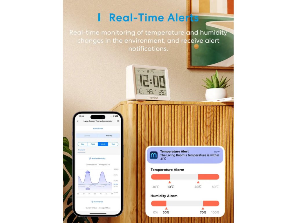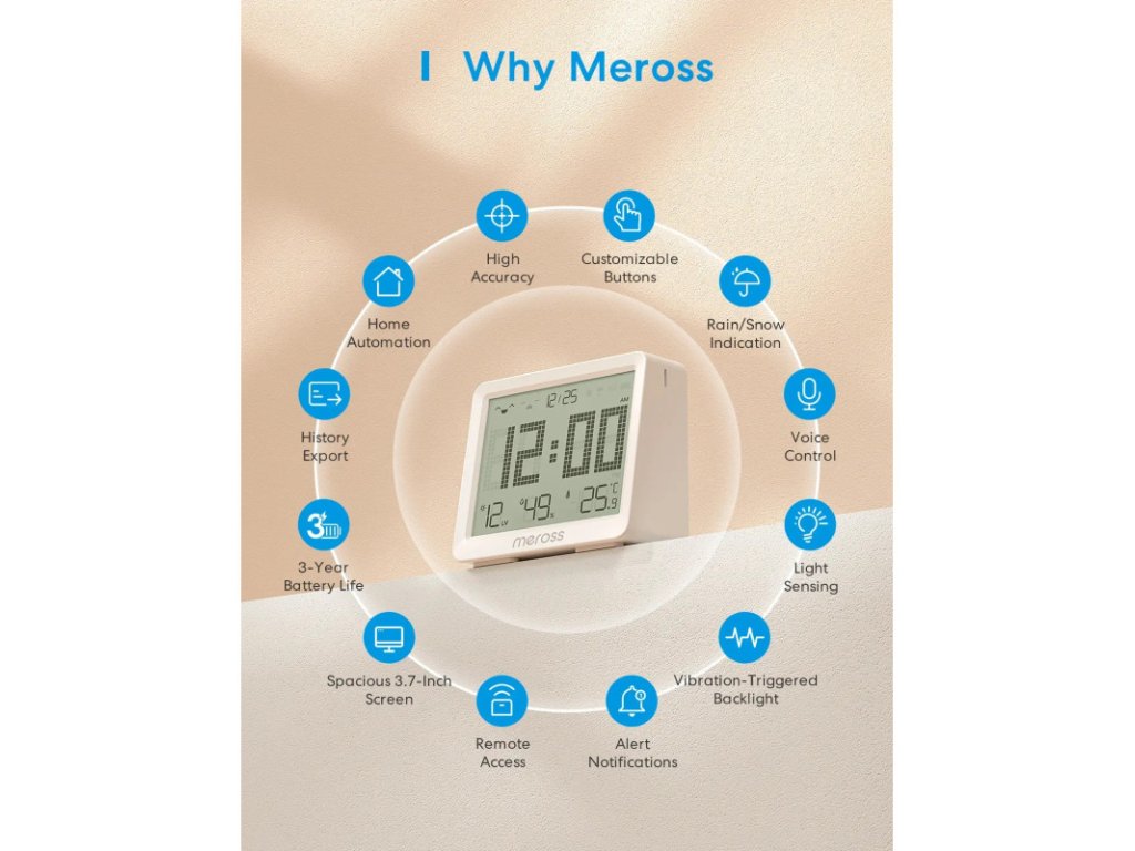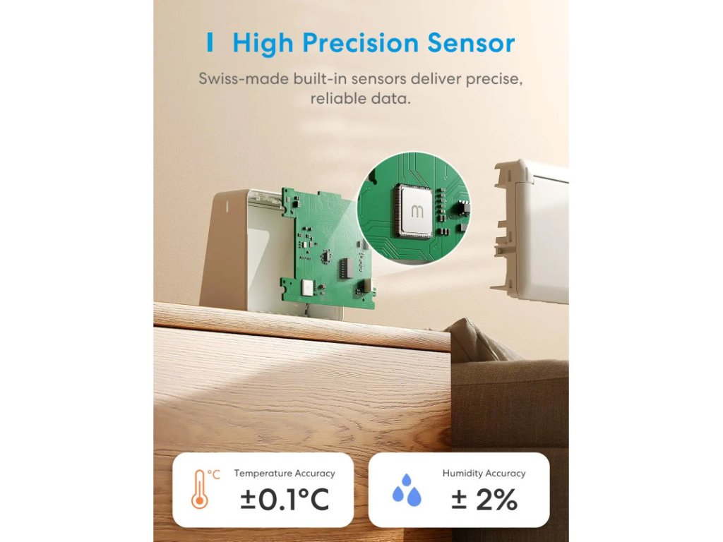 Meross MS130 je moderní senzor pro sledování teploty, vlhkosti a úrovně osvětlení, ideální do domácností, skleníků, sklepů i ložnic. Využívá vysoce přesné senzory švýcarské výroby, díky nimž poskytuje mimořádně přesná data.