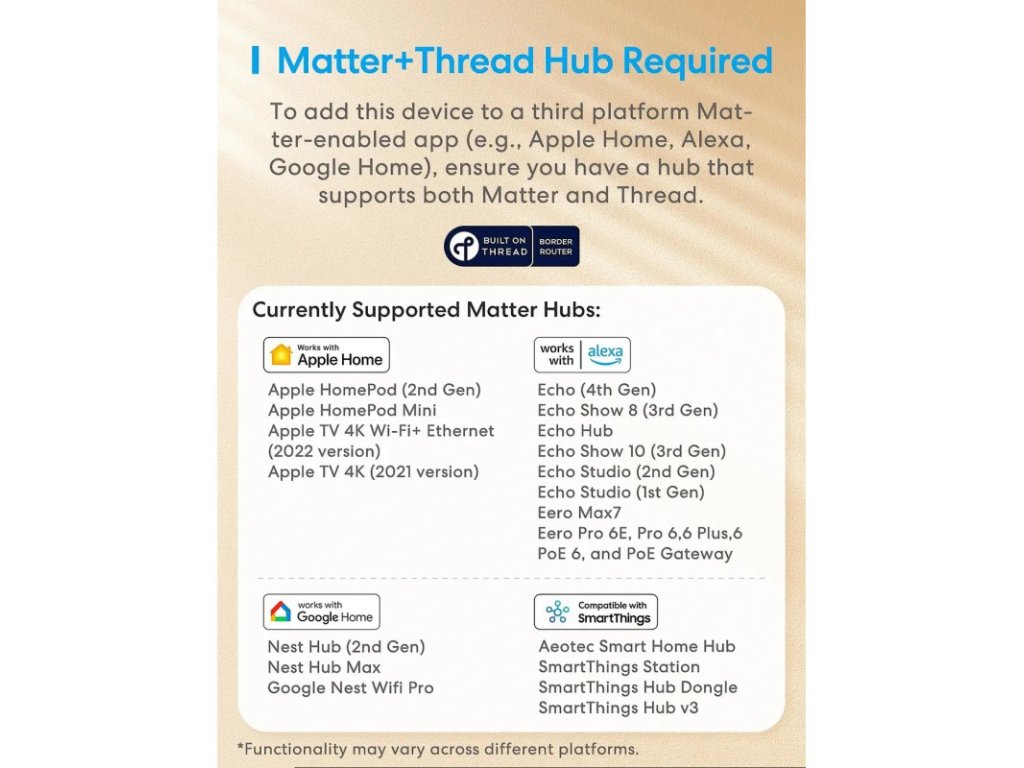 Pro integraci do platforem, jako jsou Apple Home, Amazon Alexa, Google Home, SmartThings nebo Home Assistant, je nutný hub s podporou Matter i Thread.