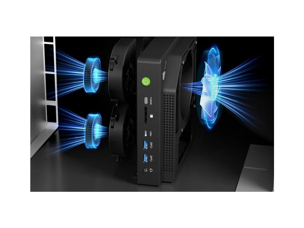 EVO-X2 využívá pokročilý chladicí systém se třemi heatpipe, dvěma velkými ventilátory pro CPU a samostatným chlazením RAM a SSD. Díky tomu zůstává systém stabilní a tichý i při dlouhodobém zatížení. Integrované RGB podsvícení s 16 režimy lze ovládat přímo tlačítkem na těle zařízení.