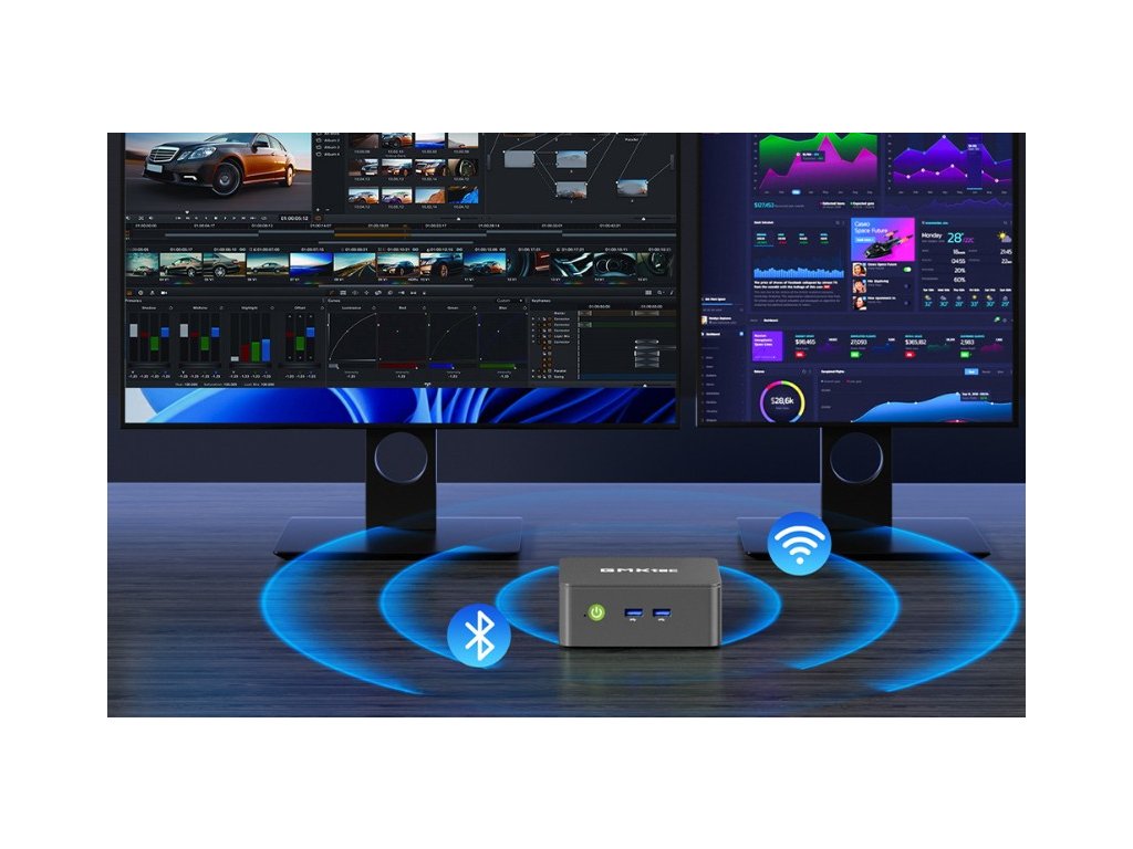 GMKtec G3S nabízí Wi-Fi 5 pro rychlé a stabilní bezdrátové připojení, Bluetooth 5.0 pro periferie a gigabitový RJ45 port pro kabelovou síť. K dispozici je také kombinace USB portů – tři USB 3.2 pro rychlá zařízení a jeden USB 2.0 pro běžné příslušenství. Nechybí ani 3,5mm audio konektor a napájecí port 12V/3A. Díky bohaté konektivitě tak lze mini PC snadno propojit s monitory, tiskárnami, NAS servery, televizory či externím úložištěm.