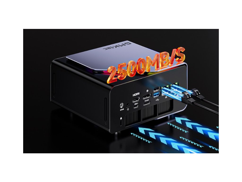 Mini PC je vybaveno dvěma ethernetovými porty RJ45 s rychlostí až 2,5 Gb/s, které zajišťují stabilní a rychlé kabelové připojení. Bezdrátovou konektivitu obstarává Wi-Fi 6E s podporou pásma 6 GHz a Bluetooth 5.2 pro spolehlivé připojení periferií.
