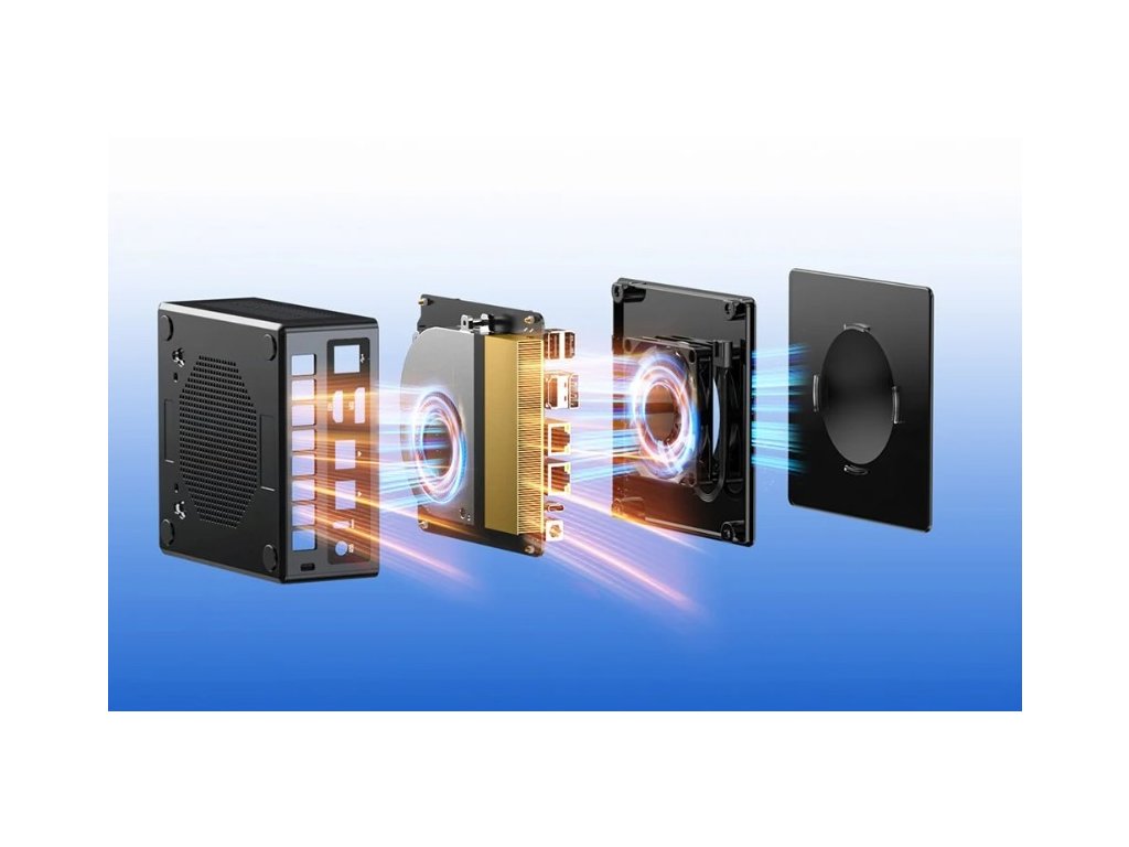 Mini PC s rozměry pouhých 132 × 130 × 59 mm a váhou 600 g lze snadno umístit na stůl nebo připevnit na zadní stranu monitoru pomocí VESA držáku, což šetří místo a zvyšuje ergonomii pracovního prostoru.