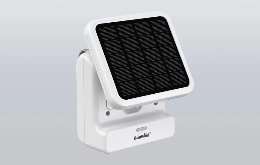 Napájení zajišťuje solární panel s možností nastavení úhlu až do 90°, který dobíjí integrovanou baterii. Systém tak funguje i bez přímého připojení k elektřině a je vhodný pro balkony, zahrady i místa bez dostupné zásuvky.