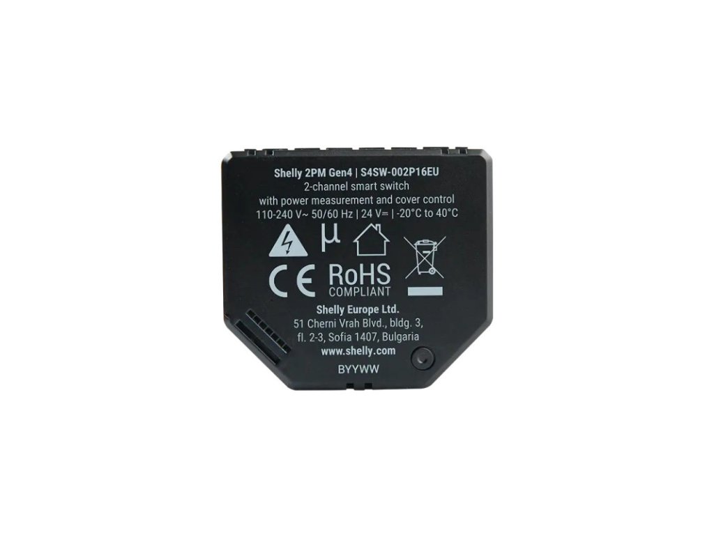 Shelly 2PM Gen4 je inteligentní spínač s dvoukanálovým ovládáním, měřením spotřeby a ovládáním krytu. Ovládejte a monitorujte na dálku dva různé elektrické obvody, nebo rolety, žaluzie a jiné obousměrné motory odkudkoli. Ideální pro dovybavení standardních elektroinstalačních krabic, zásuvek a vypínačů osvětlení, a to iv prostorách s omezeným prostorem.