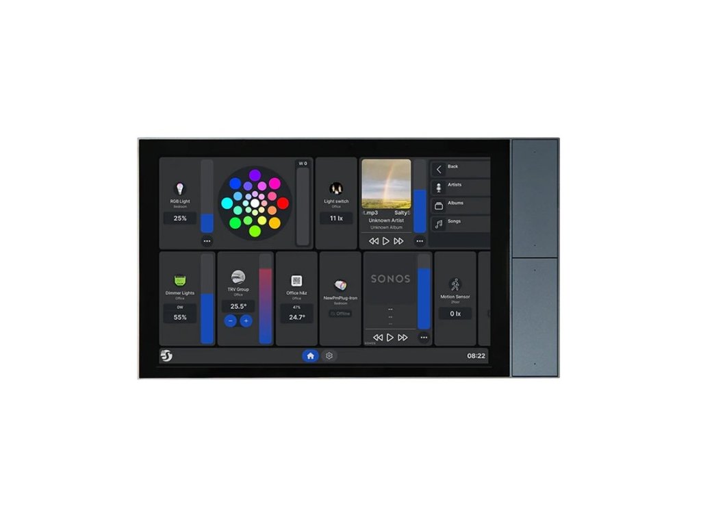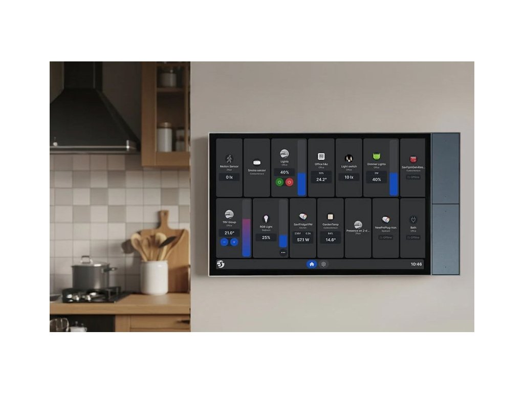 Shelly Wall Display XL je moderní 10,1″ nástěnný panel, který spojuje ovládání osvětlení, topení, spotřebičů, scén i multimédií do jednoho elegantního zařízení. Velká a přehledná obrazovka nabízí okamžitý přístup k tomu, co v domácnosti používáte nejčastěji – světla, teplota, žaluzie, multimédia nebo stav spotřeby.