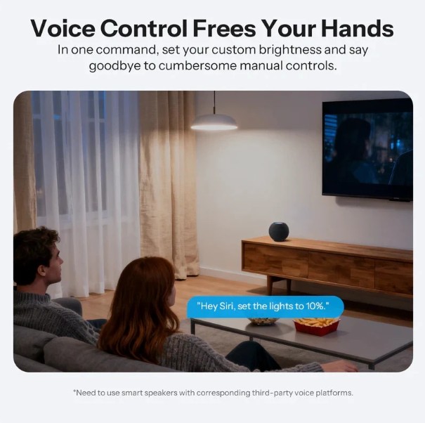 Ovládání jasu je možné přes aplikaci, hlasového asistenta i fyzický vypínač. Pro Matter je obvykle vyžadován kompatibilní Matter hub / řídicí jednotka.
