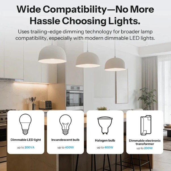 Tím se minimalizuje blikání, zlepší plynulost změn jasu a zajistí stabilní provoz i u citlivějších LED světel. Použité trailing-edge stmívání je vhodné pro moderní LED technologie.