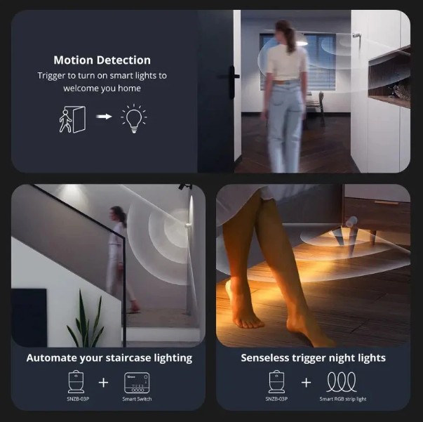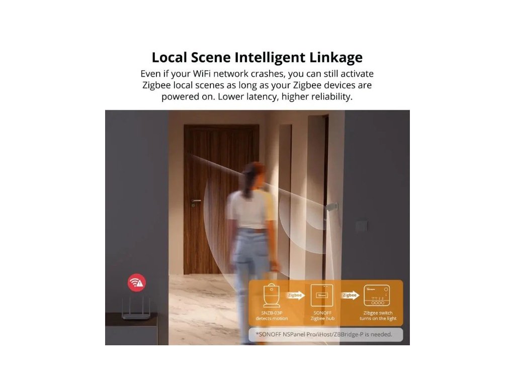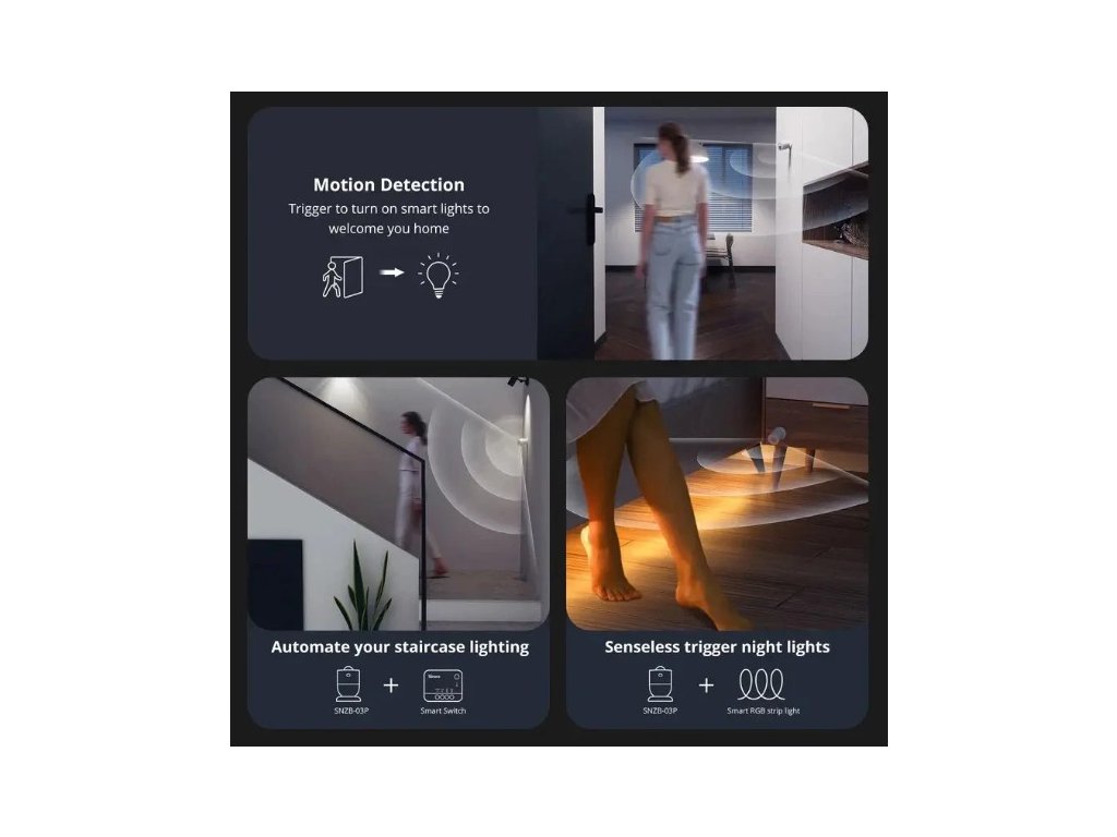 Vejdete večer do chodby a světlo se rozsvítí samo. V noci nemusíte hledat vypínač a ráno se světla zbytečně nerozsvítí, když už je den. SONOFF SNZB-03P přesně tohle zvládá – tiše, automaticky a spolehlivě.