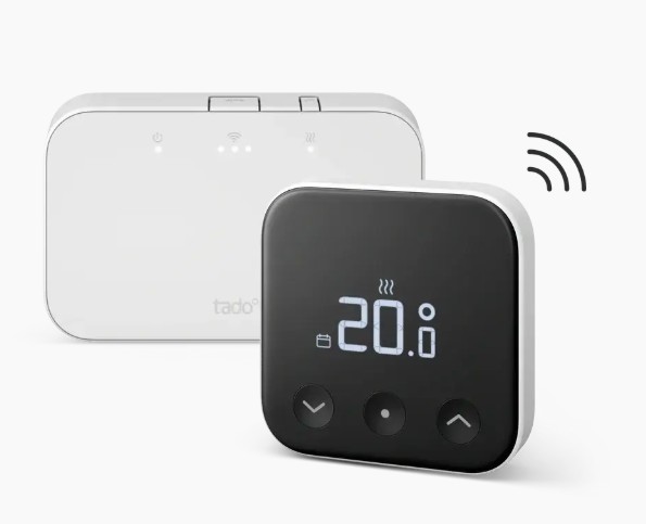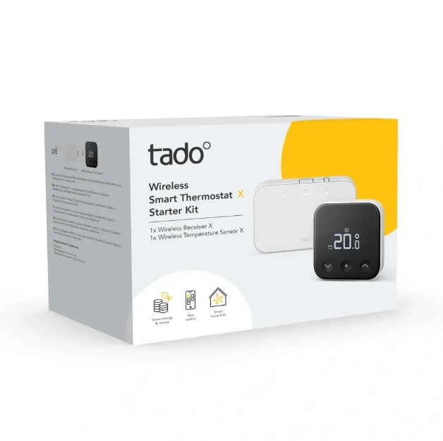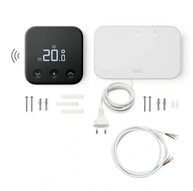 tado° Wireless Smart Thermostat X Starter Kit je kompletní sada pro inteligentní řízení vytápění v domácnosti. Obsahuje bezdrátový pokojový termostat (Wireless Temperature Sensor X) a přijímač Wireless Receiver X, který se připojuje ke kotli nebo tepelnému čerpadlu a zároveň funguje jako Thread Border Router pro připojení zařízení k internetu.