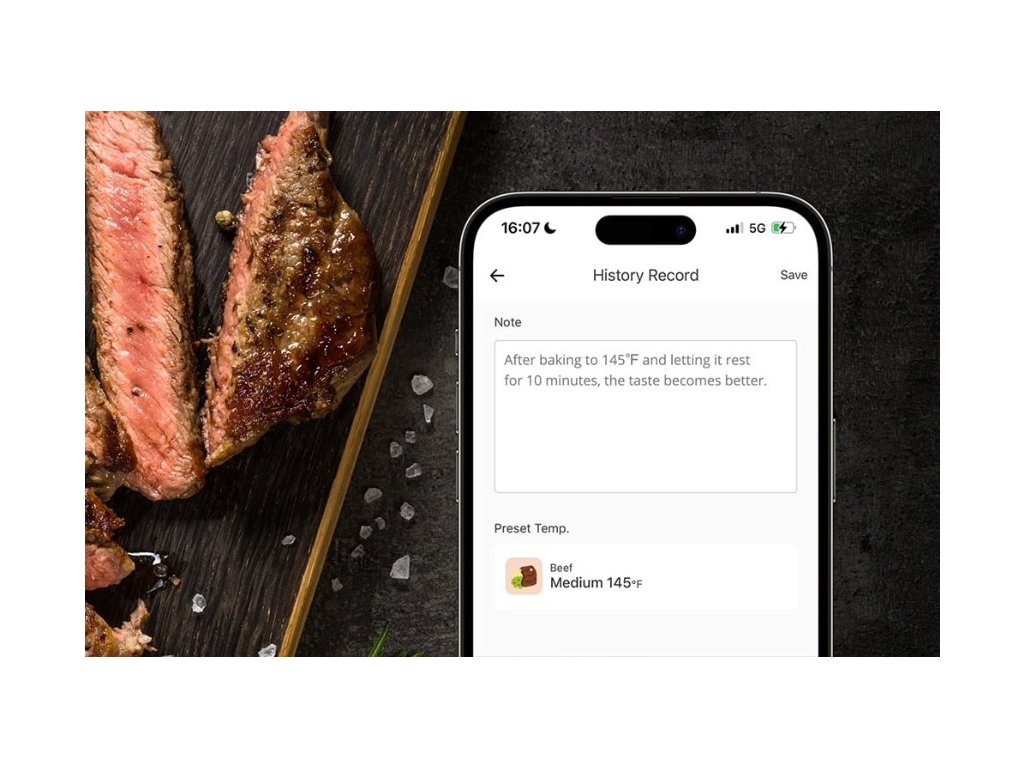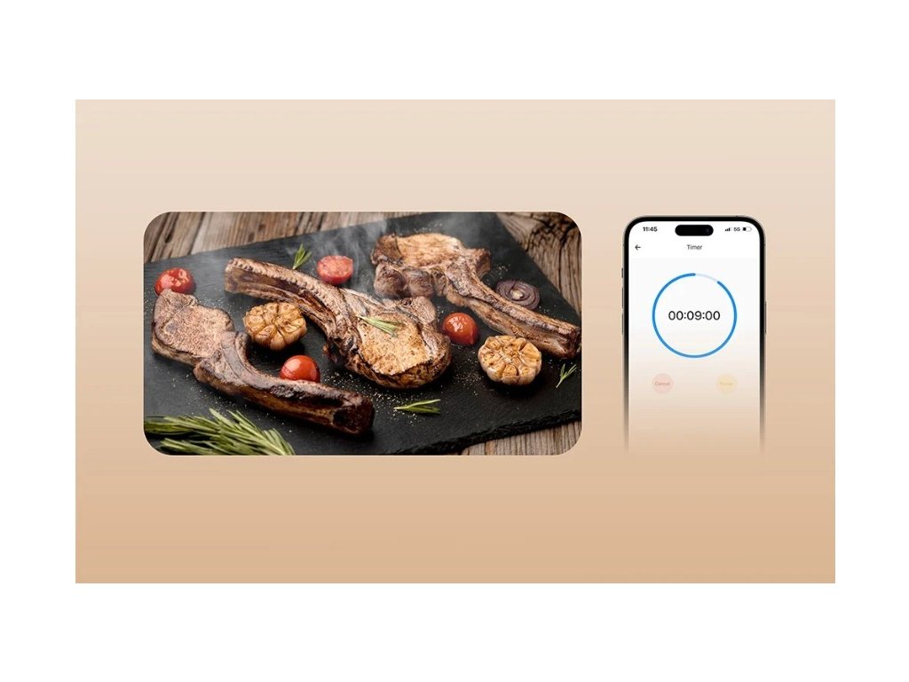 Jakmile maso dosáhne přednastavené teploty, zařízení vás upozorní zvukovým signálem. K dispozici je také časovač pro odpočinek masa, který upozorní, kdy je čas pokrm servírovat. V aplikaci najdete doporučení pro ideální teploty různých typů masa a grafy vývoje teploty.
