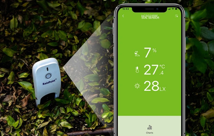 Zařízení je navrženo pro použití v exteriéru. Krytí IPX5 chrání elektroniku před vlhkostí a stříkající vodou, takže senzor bez problémů zvládne déšť i běžné venkovní podmínky. Světelný senzor umístěný v horní části zařízení navíc umožňuje sledovat intenzitu osvětlení, což je důležité zejména u rostlin citlivých na množství světla.