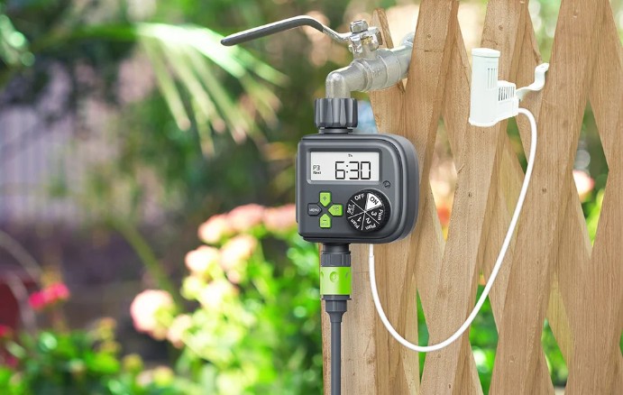 Součástí balení je kabelový dešťový senzor, který automaticky zastaví zavlažování při srážkách. Tím se zabrání přemokření půdy a zbytečné spotřebě vody. Jakmile senzor vyschne, zařízení se samo vrátí k naprogramovanému režimu.