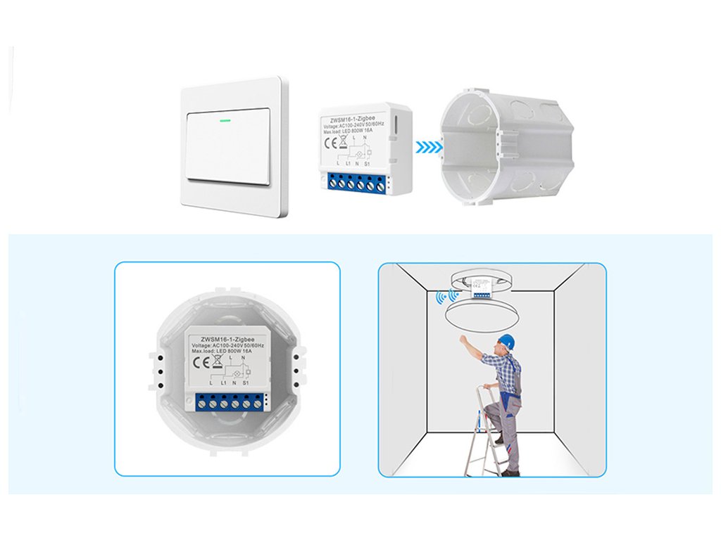 Díky svému kompaktnímu provedení je ZWSM16-W2 kompatibilní s různými typy vypínačů a hodí se až do 95 % instalačních krabic na trhu. Můžete jej také připevnit na svítidlo. Jeho instalace vám nezpůsobí žádné problémy ani nezabere příliš mnoho času. Navíc můžete použít i 2 vypínače k ovládání jednoho svítidla, což je ideální například v blízkosti schodiště. Takto můžete pohodlně zapnout světlo v přízemí a vypnout ho, když jdete nahoru!